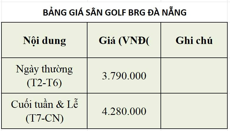Dưới đây là bảng tham khảo Giá sân golf BRG Đà Nẵng cho khách nước ngoài 2026 theo từng khung giờ.