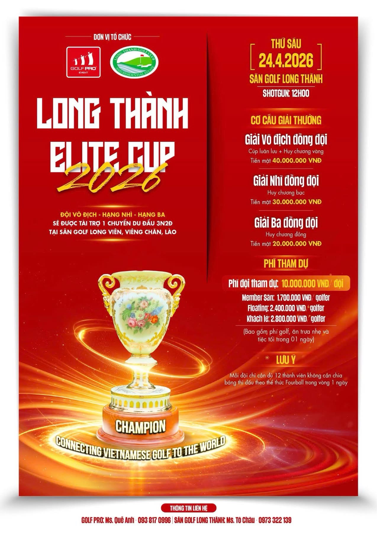 Điểm nhấn đặc biệt: Top 3 đội xuất sắc nhất sẽ được tham gia chuyến du đấu 3 ngày 2 đêm tại Sân Golf Long Viên, Viêng Chăn, Lào vào tháng 5/2026. Đây là cơ hội quý báu để các đội giao lưu, thi đấu quốc tế và trải nghiệm golf Lào.